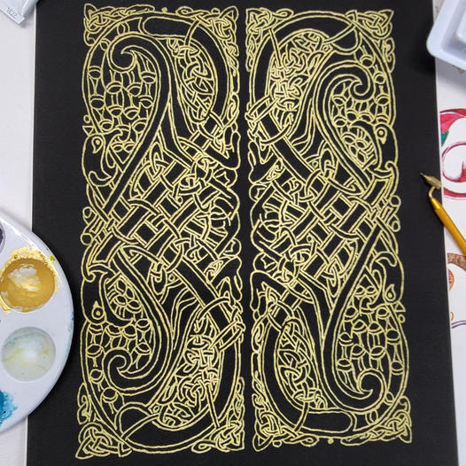 My work is inspired by sacred architecture, medieval manuscripts, and the type of lore you’d overhear in a tavern full of elves. I love making artwork that feels like it could belong in a cathedral, or the castle you call home.